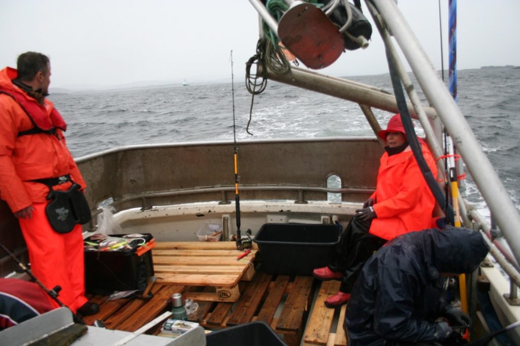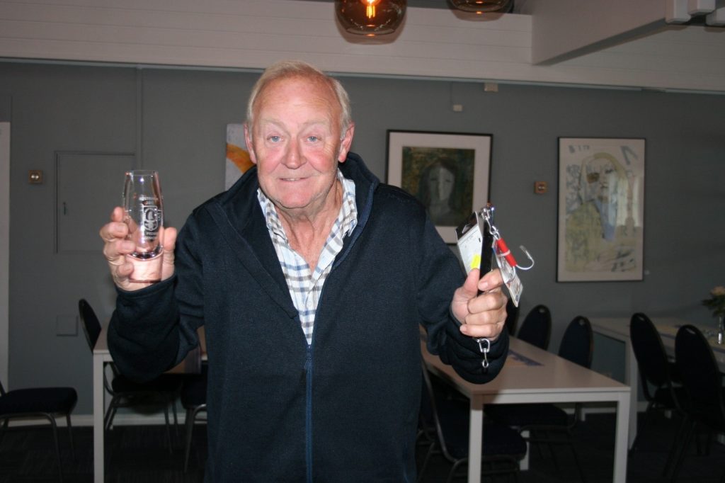Hos oss på kirkebåten fisket vi hele dagen rundt denne ene grunnen på 70 meter. På styrbord side fikk jeg nesten ikke fisk de siste 2 timene, mens Arne Reitan hadde fisket seg oppover. Han slo til med en grei lange og på vei opp smalt det på en fin sei. Han vant styrbord side med 5 kg mer enn meg og sikret seg 1.Plass for Seniorer. På andre siden av båten var Lars Hellum i en klasse for seg. Han fisket med 2 sorte gummimakker str 6/0 og en svenskepilk. Seiene var ikke så stor, men det ble mange av de. Han fikk 45.95 kg . Dette ga han 145.95 poeng og 2 .plass i herre klassen.